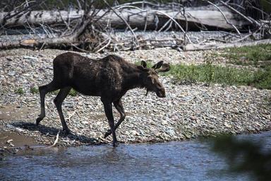 Keywords: bull moose young wildlife nature male antlers wilderness river bank walking portrait outdoors juvenile rocks stream river