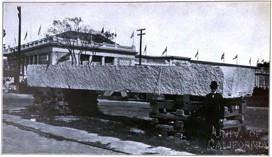 | Keywords: Bulletin 426 Plate XX Granite Monolith.jpg  Mount Airy Surry County NC <br>Text from the volume describing this figure <br>The North Carolina Granite Corporation is adequately equipped with all necessary modern machinery and appliances for quarrying and handling the stone In 1905 a large stone-cutting plant was erected The stone is carried from the quarries to the railway cars by a system of inclined cableways run by gravity The limit in size of dimension stone is the capacity of the railroad cars Blocks weighing 20 tons are reported to have been frequently shipped from the quarries See Pl XX 1910 Granites of the Southeastern Atlantic States Bulletin 426 United States Geological Survey Government Printing Office Washington 1910 Watson Thomas Leonard other versions PD-USGov Geology Quarrying |