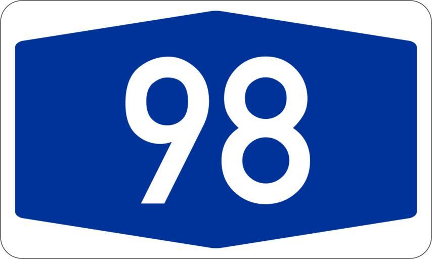 Keywords: Bundesautobahn 98 number.svg Bundesdeutsche Autobahnnummer Automatisch erzeugt durch 3247 German Autobahn number signet Created automatically by 3247 Bundesautobahn numbers 098 Bundesautobahn 98 98 number