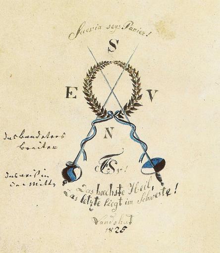 | Keywords: Bundeszeichen Suevia Landshut 1825.jpg  Bundeszeichen of Corps Suevia München 1825 at that time located in Landshut Entwurfszeichnung des Bundeszeichens des de Corps Suevia München damals noch in Landshut angefertigt von einem Jenaer Porzellanmaler zur Prüfung durch die potenziellen Kunden in Landshut Beischrift Suevia seys Panier Das hoechste Heil <br> Das letzte liegt im Schwerte <br> Landshut<br> 1825 Die umgeschriebenen Großbuchstaben SENV stellen den Wappenspruch des Corps dar sit ensis noster vindex Korrekturanmerkungen am Rande das Band etwas breiter das weiß in der Mitte Art print of archive of de Verband Alter Corpsstudenten VAC in Würzburg/Germany Unknown porcelain painter of Jena 1825 Corps Suevia München Coats of arms of Kösener Corps Documents of Kösener Corps PD-Art |