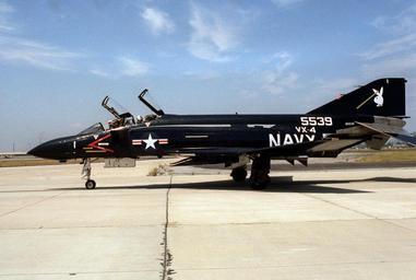 Keywords: Bunny F-4S VX-4 at Point Mugu 1982.JPEG A U S Navy McDonnell F-4S Phantom II BuNo 155539 from Test and Evaluation Squadron 4 VX-4 at Naval Air Station Point Mugu California USA in 1982 This aircraft was retired to the AMARC as 8F0222 on 2 May 1986 http //www defenseimagery mil U S DefenseImagery photo VIRIN http //www defenseimagery mil/imagery html guid 9fe604964d6d8ca2b1bd21d28b92495eeecc5028 DN-SC-83-10432 1982-07-14 PH2 Chris Holmes USN PD-USGov-Military-Navy F-4S Phantom II Air Test and Evaluation Squadron 4 United States Navy Pacific Missile Test Center Point Mugu Playboy bunny logos Black aircraft