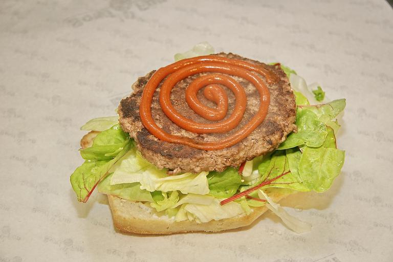 Keywords: burger cooking salad ketchup tomato ketchup tastes under the bun provisioning taste food bread beef steak dining