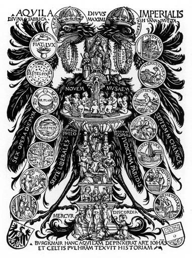 | Keywords: Burgkmair Reichsadler mit Collegium poetarum.jpg  Reichsadler mit Allegorien des Collegium poetarum et mathematicorum <br /> Doppeladler mit Dichterkränzen Brunnen Musenquell Hippokrene gestaltet wie ein Lebens-/Jungbrunnen 9 Musen die Philosophie mit den 7 freien Künsten unten der schlafende Paris und der sich nähernde Merkur Hubert Schrade Sinnbilder des Reiches München 1938 Abb 25 vor 1508 before 1508 Hans Burgkmair Public Domain Creator Hans Burgkmair d Ä PD-old-100 Coats of arms of the Holy Roman Empire Fountain of Youth Hans Burgkmair d Ä |