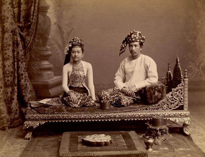 | Keywords: Burmese upper class couple.jpg en Photograph of a Burmese upper class couple Burma Myanmar probably taken by Philip Adolphe Klier in the 1890s In this full-length studio portrait the man and woman are shown seated on a carved wooden couch Both are dressed in garments fine fabrics and jewels which were reserved for court officials by sumptuary laws during the Konbaung Dynasty 1752-1885 and after the fall of the Burmese monarchy were worn by the wealthy The woman is adorned with jewelled and floral head ornaments necklaces and other jewellery a muslin jacket over a breast cloth and a wrap-around skirt or hta-mein with a dark waistband which is probably made of silk Her husband wears a turban a cotton or muslin jacket and the man ™s lower garment known as a pahso Klier of German origin began as a professional photographer in Moulmein in Lower Burma in 1871 In a few years he had built up a considerable reputation and based himself in Rangoon He took hundreds of photographs mostly for Europeans both as a memoir of their stay in Burma and to feed the great interest in pictures of the country in Europe He was known as a specialist in art photography and his work was published in art books He was interested in portraying images of mosaics woodcarving and other crafts of Burma In fact he later became a dealer in arts and crafts such as silverware and furniture 1895 http //www bl uk/onlinegallery/onlineex/apac/photocoll/other/019pho0000088s1u00043000 html Burmese couple of the upper class seated on a wooden couch Philip Adolphe Klier PD-old Uploaded with UploadWizard People of Myanmar |