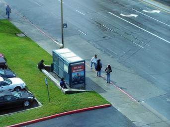 Keywords: Bus stop US.jpg A bus stop during a rainy day taken from a building 2006-02-28 own assumed Mboverload~commonswiki Bus shelters in the United States Unidentified locations