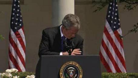 Keywords: Bush Bird poop 3.png Image Screen shot Image 3 of 4 of United States President George W Bush wipes off bird feces with his bare hand during a press conference on May 24 2007 in the White House Rose Garden Bush was addressing the American press in the White House's Rose Garden The incident occurred just as Bush said I've got confidence in Al Gonzales doin' the job referring to a question asked by a reporter about the controversial dismissal of several U S attorneys Source http //www whitehouse gov/news/releases/2007/05/20070524 html <br /> Direct link to video http //mfile akamai com/5913/wmv/whitehouse download akamai com/5913/2007/05/20070524 v asx obj 2 must download/open link into a player such as VideoLAN PD-USGov George W Bush in 2007 20070524 West Colonnade White House W