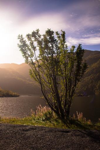 Keywords: bush plant water mood autumn fjord norway sky clouds evening nature landscape fog tree back light sunny