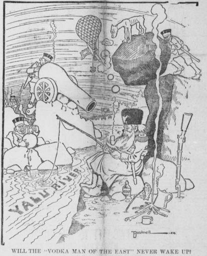 | Keywords: Bushnell cartoon about Russian somnolence in the face of Japanese aggression.jpg Russian Empire sits placidly by the Yalu River clutching his fishing rod and smoking a pipe; by his side is a bottle of vodka Multiple Imperial Japan Japanese soldiers prepare to launch attacks on him <p>The caption asks WILL THE 'VODKA MAN OF THE EAST' NEVER WAKE UP 1904-04-27 http //chroniclingamerica loc gov/lccn/sn88085187/1904-04-27/ed-1/seq-1/ The Tacoma Times Creator E A Bushnell other versions PD-old-70-1923 Uploaded with UploadWizard Cartoons by E A Bushnell Images from The Tacoma Times |