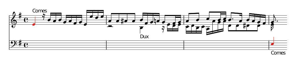 | Keywords: BuxWV142-Comes-Dux.svg  de Dux und Comes von Fuge BuxWV 142 nach File BuxWV142-Comes-Dux GIF Erstellt mit LilyPond Dux and Comes or leader and follower in BuxWV 142 after File BuxWV142-Comes-Dux GIF Made with LilyPond Source Code <pre> \version 2 10 0 << Violinschlüssel Stimme 1 \clef violin \time 4/4 \key g \major \override NoteHead 'color red \override Stem 'color red e'4 Comes \override NoteHead 'color black \override Stem 'color black r16 b' a' b' g' a' fis' g' e' e d e a'8 a' ais' ais' b'16 fis' g' a' g'8 fis'16 g' \noBreak a'8 b' c b'16 c b'8 a'16 b' a' g' fis'\noBreak g'8 \\ Violinschlüssel Stimme 2 \clef violin \time 4/4 \key g \major s1 r2 b4_ Dux r16 e' d' e' c' d' b c' a a' g' a' d'8 d' dis' dis' e'16 Bassschlüssel \new Staff \clef bass \time 4/4 \key g \major s1 s s \override NoteHead 'color red \override Stem 'color red \stemUp e4_ Comes s4 s4 >> </pre> 2012-05-07 own Christian Stroppel SVG Brian Ammon File BuxWV142-Comes-Dux GIF cc-zero Sheet music of Dieterich Buxtehude Fugues |