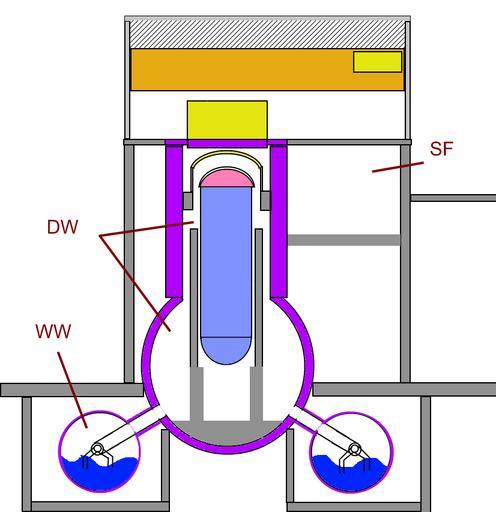 | Keywords: BWR Mark I Containment sketch primary.png en Rough sketch of a typical Boiling water reactor BWR Mark I Concrete Containment with Steel Torus including downcomers as used in the BWR/1 BWR/2 BWR/3 and some BWR/4 model reactors The primary containment is outlined in purple DW Drywell WW Wetwell SF Spent Fuel Pool light blue with pink dome Reactor Pressure Vessel purple Secondary Concrete Shield Wall fr Diagramme/coupe d'un réacteur à eau bouillante REB typique de type Mark I à enceinte de confinement en béton avec tore d'acier sous-jacent tel qu'utilisé dans les réacteurs de type REB/1 REB/2 REB/3 et certains REB/4 es Diagrama/corte esquemático de un reactor de agua en ebullición tipico del tipo Mark I con recinto de contención en hormigón con toro subyacente en acero como los utilizados en los reactores de tipo BWR/1 BWR/2 BWR/3 y algunos BWR/4 ca Esquema d'un reactor d'aigua en ebullició BWR Boiling water reactor de tipus Mark I amb contenció de formigó i torus d'acer incloent baixants com els utilitzats en els models de reactor BWR/1 BWR/2 BWR/3 i alguns BWR/4 DW Pou sec WW Pou moll SF Piscina del combustible gastat Sketched in Paint net using 826 x 852 canvas inspired by Page 15 pdf 40 Containment Integrity Research at Sandia National Laboratories - An Overview Manuscript completed March 2006 Published July 2006 id NUREG/CR-6906 and SAND2006-2274P http //www nrc gov/reading-rm/doc-collections/nuregs/contract/cr6906/cr6906 pdf - Prepared by Sandia National Laboratories for the U S Nuclear Regulatory Commission Job Code Y6757 The two diagrams on the same page are labeled Figure 5 Typical BWR Mark I Concrete Containment with Steel Torus User 84user 2011-04-04 <gallery>File BWR Mark I Containment diagram png original diagram from page 15 of the source File BWR Mark I Containment sketch png sketch without downcomers </gallery> technology ImageNote 2 329 273 96 321 826 852 2 reactor pressure vessel ImageNoteEnd 2 ImageNote 3 314 382 16 231 826 852 2 Cylindrical biological shield ImageNoteEnd 3 ImageNote 4 332 277 92 34 826 852 2 Top head assembly ImageNoteEnd 4 ImageNote 7 311 167 135 80 826 852 2 Drywell head and refueling assembly ImageNoteEnd 7 ImageNote 8 233 240 293 518 826 852 2 Inverted lightbulb drywell containment chamber ImageNoteEnd 8 ImageNote 9 208 34 474 199 826 852 2 Upper part of building housing crane and refueling assembly ImageNoteEnd 9 ImageNote 10 92 683 567 138 826 852 2 Wetwell torus holding the suppression pool of water to handle excess steam vented from the reactor above ImageNoteEnd 10 ImageNote 11 483 245 181 144 826 852 2 Spent fuel pool area highly simplified here ImageNoteEnd 11 ImageNote 12 216 78 458 74 826 852 2 Gantry crane ImageNoteEnd 12 ImageNote 13 554 740 69 57 826 852 2 Downcomer tubes duct the steam below the water surface so that it condenses thereby reducing the pressure ImageNoteEnd 13 Schemata of boiling water reactor |