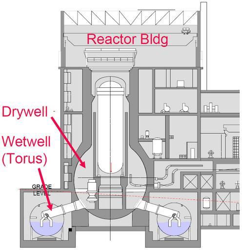 | Keywords: BWR Mark I Containment, diagram.png en Diagram of a typical Boiling water reactor BWR Mark I Concrete Containment with Steel Torus as used in the BWR/1 BWR/2 BWR/3 and some BWR/4 model reactors fr Diagrame/coupe d'un réacteur à eau bouillante REB typique de type Mark I à enceinte de confinement en béton avec tore d'acier sous-jacent tel qu'utilisé dans les réacteurs de type REB/1 REB/2 REB/3 et certains REB/4 Page 15 pdf 40 Containment Integrity Research at Sandia National Laboratories - An Overview Manuscript completed March 2006 Published July 2006 id NUREG/CR-6906 and SAND2006-2274P http //www nrc gov/reading-rm/doc-collections/nuregs/contract/cr6906/cr6906 pdf - Prepared by Sandia National Laboratories for the U S Nuclear Regulatory Commission Job Code Y6757 Sandia National Laboratories Source published July 2006 but this diagram may predate this <gallery> File BWR Mark I Containment sketch png Rough sketch inspired by this original File Reaktor svg Better diagram but at 90 degree rotation </gallery> The two diagrams on the same page are labeled Figure 5 Typical BWR Mark I Concrete Containment with Steel Torus The report text describing the diagrams on page 10 pdf 35 is BWR Mark I The Mark I is a pressure suppression containment Figure 5 which allows the containment to be smaller in volume The containment is divided into the drywell containing the reactor vessel and the wetwell torus containing the suppression pool The containments are constructed of either concrete or steel The water in the suppression pool acts as an energy absorbing medium in the event of an accident If a LOCA loss of coolant accident occurs steam flows from the drywell through a set of vent lines and downcomers into the suppression pool where the steam is condensed Steam can also be released from the reactor vessel through the safety relief valves and associated piping directly into the suppression pool In the event that the pressure in the wetwell exceeds the pressure in the drywell vacuum breakers are provided that equalize the pressure Mark I containments are equipped with lines connected to the wetwell that can be used to vent the containment if the pressure becomes too high PD-USGov ImageNote 1 226 222 306 529 826 852 2 Inverted lightbulb drywell containment chamber ImageNoteEnd 1 ImageNote 2 329 273 96 321 826 852 2 reactor pressure vessel ImageNoteEnd 2 ImageNote 3 314 382 16 231 826 852 2 Cylindrical biological shield ImageNoteEnd 3 ImageNote 4 332 277 92 34 826 852 2 Top head assembly ImageNoteEnd 4 ImageNote 5 274 158 204 94 826 852 2 Drywell head and refueling assembly ImageNoteEnd 5 ImageNote 6 215 94 462 67 826 852 2 Gantry crane ImageNoteEnd 6 Schemata of boiling water reactor |