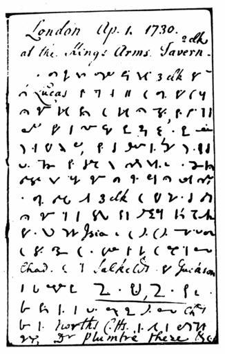 | Keywords: Byrom shorthand 1730.png en John Byrom's shorthand writing in his own shorthand system Transcription I came here from Cambridge last Friday 3 o'clock with Mr Lucas We set out 11 and came to Ware that night My horse tired with me and tired me severely We lay at the Crown where the man's daughter has just died I was sick but it were of God We had beginners to supper but I had no stomach We talked of moral fortitude I spoke to my landlord for another horse which he got me next morning I came to London about 3 o'clock and went after I had left my horse at the Dolphin Went to Bishopsgate Timing sad betimes where I found brother Josiah and by the bye sister Anne came Willy Chaddock and I drank tea there and called at cousin Chad And at Salkeld's where Jackson the town clerk was Surprise I went surprise I would I thence home to the new coffee house by cousin Chaddock's Thence to North's coffee hse to read the Grub street journal Dr Plumtre there etc Shorthand notes by John Byrom reprinted in Joy Hancox's book The Queen's Chameleon page 81 John Byrom 1692-1763 1730 Byrom's shorthand PD-old-100 |