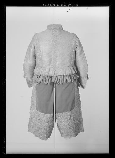 | Keywords: Byxor av brunaktig grå, oskuren sammet som tillhört Karl X Gustav (1622-1660), ca 1650 - Livrustkammaren - 1359.tif Byxorna är av samma grå oskurna sammet som kappan och av rak modell De är gjorda av 4 stycken som förutom sidorna sytts samman fram och bak Mitt framtill är ett c a 30 cm långt sprund som knäpps med en 25 cm lång knäppslå Byxorna är med glesa rynkor fästade vid en 122 cm lång linning - försedd med blott en enda skarv Denna har 6 metallhakar vilka genom fodret på baksidan trätts genom linningen I linningen återstår för närvarande blott de 5 cm långa knapphålen ty de 2 knapparna saknas I knäppslån sitter 8 st knapphål 2 cm långa sydda av 2 trådar av brunt högertvinnat silke med 5 stygn/cm Samma antalknappar finns kvar på motstående sida De är av samma sort som tröjans guld- och silvertrådsklädda knappar Byxorna har i sidsömmarna 17 cm långa sprund för de stora ficksäckarna av skinn Dessa liksom knäppslån är fodrade med samma slags brokad som tröjansfoder <br/><br/>Anmärkningsvärt är att dessa byxor saknar såväl den vanligen förekommande lilla urfickan i linningen på vänster sida framtill som den mindre vertikala fickan på högra framsidan Byxorna är på insidan fodrade med vit linnelärft c a 26x23 tr/cm2 mellanfoder saknas Byxorna är garnerade med en 15 5 cm bred oliksidig knypplad uddspets av guld- och silvertråd samma slag som på kappan Den är påsydd i 2 rader nertill runt benen samt 1rad på varje sida om sidsömmen Som garnering har dessutom bandrosetter sytts fast runt hela midjan delvis på och delvis strax under linningen <br/><br/>Nu finns 20 st sådana rosetter samt något längre ner framtill 3 rosetter på vänster sida och 2 på höger Spår efter ytterligare 2 rosetter finns på linningen och vidare bör det ha funnits en rosett som sprättats bort från höger sida M a o det stämmer bra med 1671 års inventarium som omtalar 28 st silver- guld- och silkesband Rosetterna har knutits i 2 öglor och 2 ändar dels av ett bredare band i silver och mörk olivfärgat silke b 3 3 cm delas av ett smalare band knutet på samma sätt i övervägande vitt och silver b 1 2 cm Bandåtgången kan beräknas till varje rosett av det breda bandet har dragit c a 58 cm varje rosett av det smala bandet har dragit c a 56 cm Om det ursprungligen funnits 28 rosetter har bandåtgången varit 16 24 meter för breda band och 15 68 meter för smala band <br/><br/>Där spetsgarneringen fastsytts har man under sammeten lagt in ett foder av grövre vävnad På höger framsida har byxorna ett urbränt stycke i linnefodret Likaså är hål brända på byxornas insida vid hakarna närmast fickorna Vid något senare tillfälle har man lagt ett veck framtill på varje sida på linningen och 2 hyskor och hakar har sytts fast Byxorna är märkta med bläck baktill N 44 samt har en lapp med inskr 34 Det förra numret från 1789-90 års inventarium det senare till 1821 1850 och 1855 års inv original caption 1647 velvet Färg grå d1 - dräkt - yttermaterial material sammet size cm 122 midjemått LRK Karl X Gustav av Sverige Tre Karlar 1984-1985 Kungligt klädd 1987-1989 Modelejon 2002 place of origin original filename LN_B10720_013600 56375 inventory number LRK 19830 1359 CC0 Byxor av brunaktig grå oskuren sammet som tillhört Karl X Gustav 1622-1660 ca 1650 - Livrustkammaren - 1359-negative tif <gallery caption Different images of same object > File Byxor av brunaktig grå oskuren sammet som tillhört Karl X Gustav 1622-1660 ca 1650 - Livrustkammaren - 9919 tif File Byxor av brunaktig grå oskuren sammet som tillhört Karl X Gustav 1622-1660 ca 1650 - Livrustkammaren - 18481 tif File Byxor av brunaktig grå oskuren sammet som tillhört Karl X Gustav 1622-1660 ca 1650 - Livrustkammaren - 78404 tif </gallery> Trousers Media contributed by LSH unmatched material Media contributed by LSH unmatched creator Clothing in Livrustkammaren Media contributed by LSH 2013-10 |