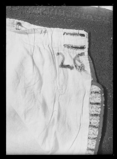 | Keywords: Byxor av svart mönstrad oskuren sammet - Livrustkammaren - 78709.tif Byxorna är av rak modell med sömmar i sidorna framtill och baktill Då tyget är så smalt som 45 cm har man varit tvungen att skarva det med en kil i varje stycke vid grenen F ö finns fickor i sidsömmarna med 17 cm långa sprund en ficka även med vertikalt sprund på höger sida belägen 14 cm från den övre kanten framtill och slutligen en liten urficka i linningen på vänster sida Byxorna är obetydligt rynkade vid den 120 cm långa linningen Mitt fram i denna sitter 2 stora d 2 4 cm knappar som knäpps med 2 4 cm långa knapphål Byxorna knäpps dessutom med en 22 cm lång knäppslå som sytts fast i sprundet framtill som är ca 30 cm långt Slån har 9 knapphål alla knapparna finns kvar de är avsamma typ som tröjans Linningen är sydd på samma ledd av sammeten och har därför varit tvungen att skarvas av 3 bitar På den sitter alla de 6 3 5-4 cm långa järnhakarna kvar De sitter på sina ursprungliga platser och är genomträdda från baksidan så att foten är synlig på linnefodret där de sytts fast Några hakar är fastsydda med brunt andra med svart silke Byxorna saknar mellanfoder Innerfodret är av vit linnelärft 30x18 tr / cm2 eller27x19 tr / cm 2 av ca 93 cm bredd man har också här måst göra små kilar grenen Fodret i byxsäckarna är likaledes av linnelärft ung samma kvalitet Dessutom är ficksäckarna stofferade med tröjans fodertyg Baktill i linnefodret har man på höger sida gjort en mindre horisontell skarv Nedtill har byxorna en ca 1 cm bred kantslå Den är sydd på snedden av tyget och når lika högt upp 1 cm på byxorna insida Byxornas fickkanter de sneddade framkanterna och tröjans kanter vid ärmuppslagen är skodda med svart band 16 inslagstr / cm Som garnering finns ännu kvar den sammankomponerade 5 cm breda spetsen av samma sort som på tröjan På ömse sidor om sidsömmarna sitter en sådan rad av spets Nedtill vid knäet finner man på samma sätt en horisontell spetsgarnering dock slutar denna ca 2 cm ovanför byxkanten Byxorna har dessutom ursprungligen garnerats med 3 rosetter i horisontell rad utanpå låren och 6 har suttit i omvänd pyramidformation på varje framstycke 3 horisontella i översta raden sedan 2 och nederst 1 original caption decade 1640 velvet Färg svart d1 - dräkt - yttermaterial material sammet LRK Karl X Gustav av Sverige Modelejon 2002 place of origin original filename LN_B13769_016649 55873 inventory number LRK 19319 78709 CC0 Byxor av svart mönstrad oskuren sammet - Livrustkammaren - 78709-negative tif <gallery caption Different images of same object > File Byxor av svart mönstrad oskuren sammet - Livrustkammaren - 70150 tif </gallery> Trousers Media contributed by LSH unmatched material Clothing in Livrustkammaren Media contributed by LSH 2013-10 |