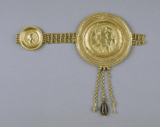 | Keywords: Byzantine - Belt Section with Medallions of Constantius II and Faustina - Walters 57527.jpg Imperial medallions such as this one of Constantius II reigned 350-361 were often mounted by their recipients to boast of their highly favored status in society This stunning example minted in Nicomedia Asia Minor represents on the reverse the triumphant emperor in his chariot Smaller coins were also mounted as jewelry like the smaller aureus honoring Galeria Faustina died 140/141 wife of Antoninus Pius Other mounted coins separated by lengths of chain would have completed this section of either a belt or a necklace late Other date century 4 Late Antique openwork gold with semiprecious stones Overall cm 15 2 19 4 ; Constantine Medallion Diam 3 3/16 x D 5/16 in 8 1 x 0 8 cm ; Faustina Medallion H 1 3/8 x D 1/4 in 3 5 x 0 7 cm accession number 57 527 27951 Henry Walters Baltimore date of acquisition unknown by purchase Walters Art Museum Henry Walters Acquired by Henry Walters 1931 Transcription Inscribed on small medallion of Faustina I obverse of coin DIVA FAVSTINA; Translation The Deified Faustina; Transcription Inscribed on reverse of coin AVGVSTA; Translation Augusta empress ; Transcription Inscribed on large medallion of Constantius II obverse of coin D ominus N oster CONSTANTIVS MAX imus AVGVSTVS; Translation Our Lord Constantius Great emperor; Transcription Inscribed on large medallion of Constantius II reverse of coin D ominus N oster CONSTANTIVS P ius F elix AVGVSTVS; Translation Our dutiful and blessed lord Constantius emperor Early Christian and Byzantine Art Baltimore Museum of Art Baltimore 1947 Jewelry - Ancient to Modern The Walters Art Gallery Baltimore 1979-1980 Late Antiquity and Early Christianity Staedtische Galerie Liebieghaus Frankfurt am Main 1983-1984 Coins and Costume in Late Antiquity Dumbarton Oaks Washington 1993-1994 Bedazzled 5 000 Years of Jewelry from the Walters Art Museum Frist Center for the Visual Arts Nashville; The John and Mable Ringling Museum of Art Sarasota; The Walters Art Museum Baltimore 2006-2009 Bedazzled 5 000 Years of Jewelry El Paso Museum of Art El Paso 2010 place of origin Nicomedia in present-day Turkey Walters Art Museum license Byzantine and Early Russian art in the Walters Art Museum Jewellery in the Walters Art Museum Byzantine belts Media contributed by the Walters Art Museum needs category review Medals of Constantius II |