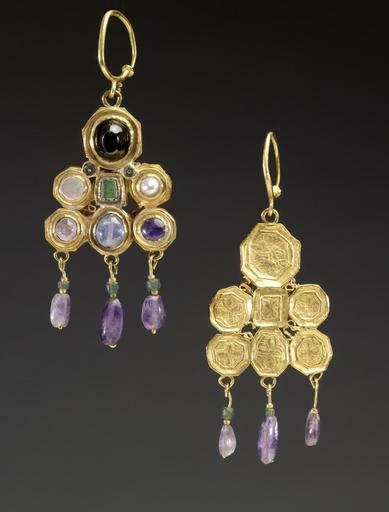 | Keywords: Byzantine - Pair of Earrings - Walters 57560, 57561 - Front Back.jpg These dramatic colorful earrings were most likely made in Constantinople perhaps as an imperial gift to a Visigothic ruler of medieval Spain where the earrings were found The Visigoths a migratory group that ultimately settled in Spain had by the 6th century established trade and diplomatic contacts with the Byzantine court whose jewelry they much admired ca 600 Early Medieval gold pearls and semiprecious stones cm 11 2 4 4 2 5 accession number 57 560 57 561 77410 Found in Estremadura Henri Daguerre Paris date of acquisition unknown by purchase Henry Walters Baltimore October 1930 by purchase Walters Art Museum Henry Walters Acquired by Henry Walters 1930 place of origin Constantinople present-day Istanbul Turkey Walters Art Museum license Ancient Roman art in the Walters Art Museum Jewellery in the Walters Art Museum Byzantine earrings Media contributed by the Walters Art Museum needs category review Byzantine jewellery Ancient earrings |