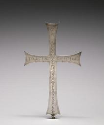 Keywords: Byzantine - Processional or Altar Cross - Walters 57632.jpg Originally this cross had pendelia jewels crosslets or Greek letters suspended from the four holes in its horizontal arms Like other medium-sized crosses with a tang this one could have been carried in procession or affixed in a stand or both 3rd quarter 6th century Late Antique silver silver sulfide inlay and copper alloy repairs cm 40 2 20 6 ; H without tang cm 33 8 accession number 57 632 17709 Excavated in Syria 1908-1910 Tawfic Abucasem Hama and Port Said ca 1913 by purchase Joseph Brummer Paris ca 1928 by purchase Henry Walters city Baltimore Walters Art Museum Henry Walters Acquired by Henry Walters 1929 Translation Having prayed Cyriacus presented this to Saint Sergius Early Christian and Byzantine Art Baltimore Museum of Art Baltimore 1947 Illuminated Manuscripts Masterpieces in Miniature The Walters Art Gallery Baltimore 1984-1985 Silver Treasure from Early Byzantium The Walters Art Gallery Baltimore 1986 place of origin northwest Bulgaria Walters Art Museum license Byzantine silver in the Walters Art Museum Byzantine crucifixes Media contributed by the Walters Art Museum needs category review |
