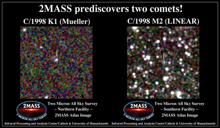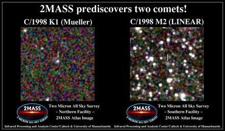 Keywords: C1998 K1 - C1998 M2 (2MASS).jpg en Atlas Images each covering 4 8´ × 4 8´ on the sky of the comets C/1998 K1 Mueller and C/1998 M2 LINEAR Occasionally 2MASS serendipitously encountered solar system bodies during its routine operations see the discussion of the known asteroid comet planet and satellite associations in the Second Incremental Data Release As reported in IAU Circular No 7500 M Sykes R Cutri J Fowler D Tholen M Skrutskie found prediscovery apparitions of these two comets before their optical discoveries in 2MASS Atlas Images acquired at the Northern Facility on Mount Hopkins and Southern Facility on Cerro Tololo respectively Comet C/1998 K1 was seen on 1998 April 4 316 UT at Ks 14 7 J-H 0 3 and H-Ks 0 2 and on May 10 223 at Ks 14 9 J-H 0 5 and H-Ks 0 0 Comet C/1998 M2 was seen on May 4 404 at Ks 14 3 J-H 0 5 and H-Ks 0 0 Both comets showed some coma but with no obvious tail http //www ipac caltech edu/2mass/gallery/images_ss html 2MASS Atlas Image Gallery Solar System Objects Two Micron All Sky Survey 2MASS a joint project of the University of Massachusetts and the Infrared Processing and Analysis Center/California Institute of Technology funded by the National Aeronautics and Space Administration and the National Science Foundation 2MASS Atlas image Comets 2MASS images |