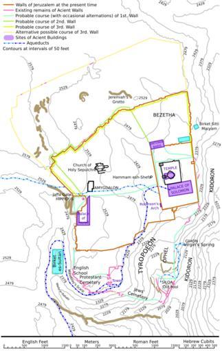 | Keywords: C+B-Jerusalem-Map2-WallsAndContours.svg en An illustration from the Encyclopaedia Biblica a 1903 publication which is now in the public domain Map 2 for article Jerusalem Plan of Ancient Jerusalem showing height contours aquaducts etc Artificially coloured from black + white original to aid clarity own MHz`as Maps of the history of Jerusalem Encyclopaedia Biblica |