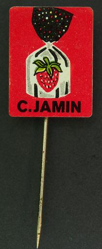 Keywords: C Jamin aardbei bonbon speltje.JPG nl Reclame speldje van een oud Nederlands product of merk en Advertising pin of an old Dutch product or brand own 2016-12-12 19 20 05 Alf van Beem Trademarked Jamin advertising pins