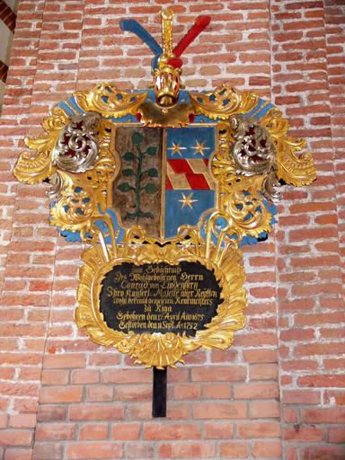 Keywords: C. v. Lindenstern.JPG Coat of arms of Conrad von Lindenstern kaiserlicher Rentmeister in Riga 1675 ”1752 In der Kirche St Peter in Riga own 2012-06-02 Christian Bickel PD-old Hatchments in Church of Saint Peter in Riga Targes heraldic shields Heraldic helmets affronty Ostrich feathers in crest Trees in heraldry 3 six rays Or in heraldry Dimidiation in heraldry Fingalo