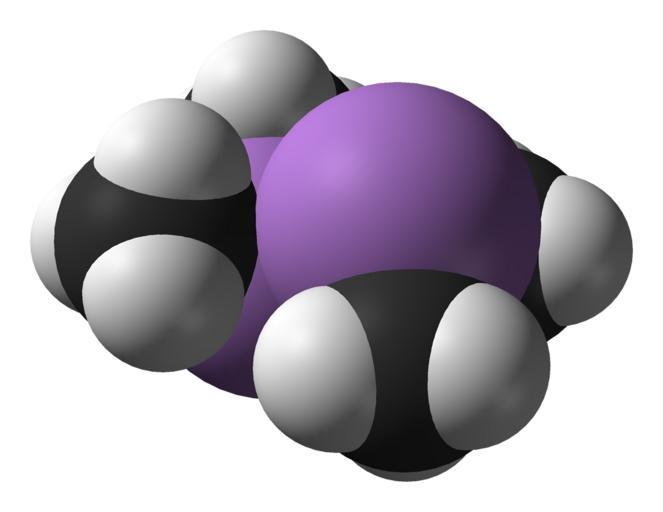 | Keywords: Cacodyl-from-xtal-1988-3D-SF.png Space-filling model of the cacodyl tetramethyldiarsine molecule C<sub>4</sub>H<sub>12</sub>As<sub>2</sub> as found in the crystal structure Colour code Carbon C black Hydrogen H white Arsenic As purple Crystal structure by X-ray diffraction from Zeitschrift für Naturforschung B Chemical Sciences 1988 43 952-958 Model constructed in http //www crystalmaker com/ CrystalMaker 8 1 Image generated in http //accelrys com/products/discovery-studio/visualization/discovery-studio-visualizer html Accelrys DS Visualizer Own 2009-06-30 Ben Mills Benjah-bmm27 Images by Ben Mills Space-filling models Cacodyl |