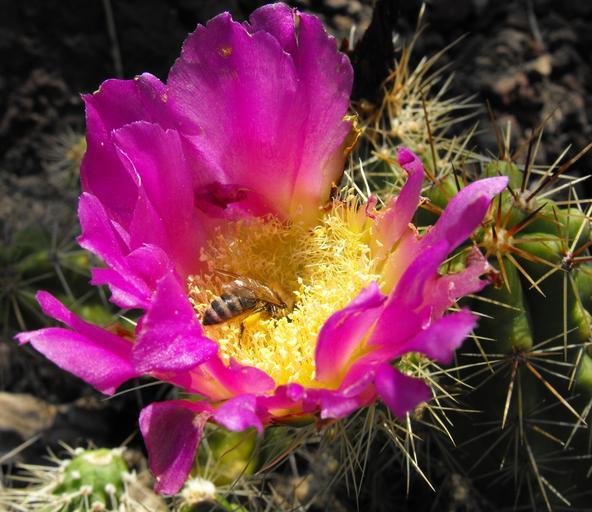 Keywords: cactus flower small bee pollen nectar blossom bloom desert echinocereus cinerascens hedgehog cactus