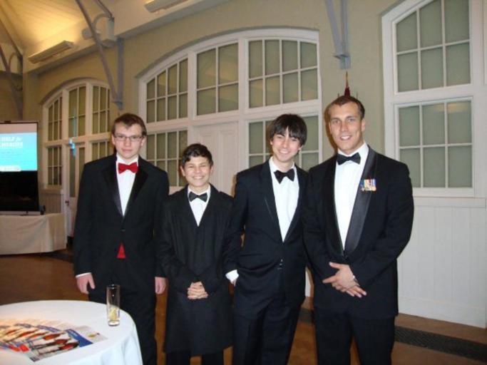 | Keywords: Cadets and organiser with LC Matt Croucher RM GC.jpg en Lance Corporal Matt Croucher RM GC poses with The Organiser Philip Day and two Cadets at the Cadet Forces 150th Anniverary Dinner held at the Honourable Artillery Company on 8th January 2010 Own Anon 2010-01-08 Cc-zero Combined Cadet Force |