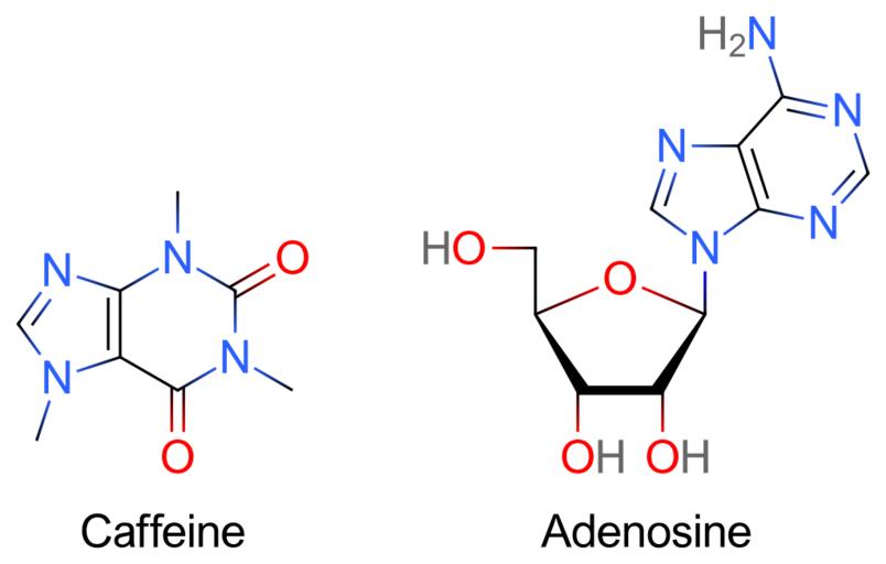 Keywords: Caffeine and adenosine.svg Chemical structure of Caffeine and Adenosine 2006-08-20 own assumed Icey derivative works Caffeine and adenosine-fr svg Caffeine Antiarrhythmic agents