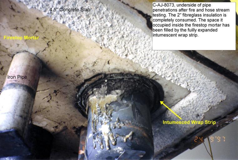 | Keywords: Caj8073 fibreglass afterwards.jpg Underside of Assembly for UL certification listing C-AJ-8073 Configuration D the mortar is intact the fibreglass has disappeared and the intumescent wrap strip has occupied the space formerly held by the insulation Own 2007-06-25 Achim Hering Firestops Cable trays Fire testing Concrete Plumbing Cement Thermal insulation Construction materials Fibreglass Intumescents CAJ 8073 FS195 3M Fire Barrier Mortar | ||||