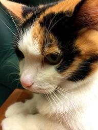 Keywords: calico cat feline kitten kitty profile orange black white green eyes whiskers looking female stare expression paws pink nose pensive face furry close head pet friend love cuddly curious tricolor fur