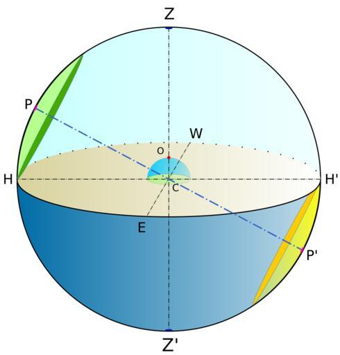 | Keywords: Calotte celesti visibile e invisibile.svg Sfera celeste sono evidenziate le calotte di perpetua visibilità e di perpetua invisibilità P è il polo celeste elevato P' il polo celeste depresso Z lo Zenith Z' il Nadir C il centro della Terra e della sfera celeste O l'osservatore sulla superficie terrestre Celestial sphere with poles C is the center of the celestial sphere O is the observer Himmelskugel mit Himmelspole O ist der Beobachter Z ist der Zenit Z' ist Nadir P ist der Himmelsnordpol P' ist der Himmelssüdpol Own 2006-12-08 CAV <gallery> Calotte celesti visibile e invisibile svg Emisferi celesti svg Hemisferio celeste svg Poli celesti svg </gallery> Astronomy sketches Celestial coordinate systems Celestial spheres |