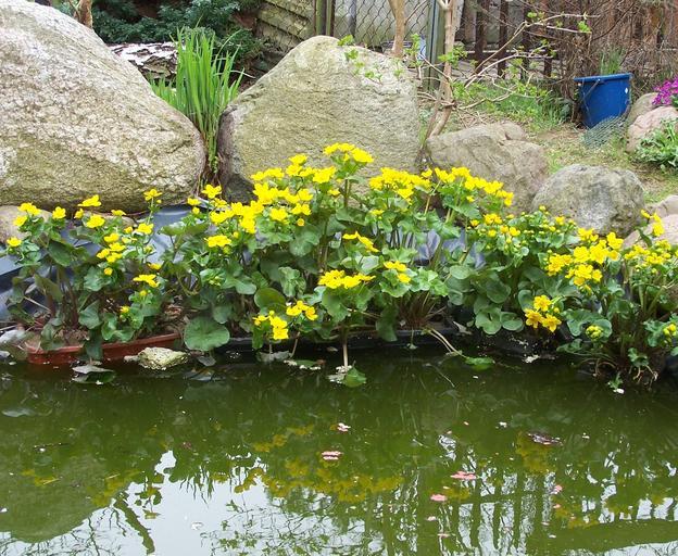 Keywords: Caltha palustris-Kaczence w oczku wodnym-2006.jpg Caltha palustris as a garden plant in artificial pond Date 2006/04/29 Caltha palustris