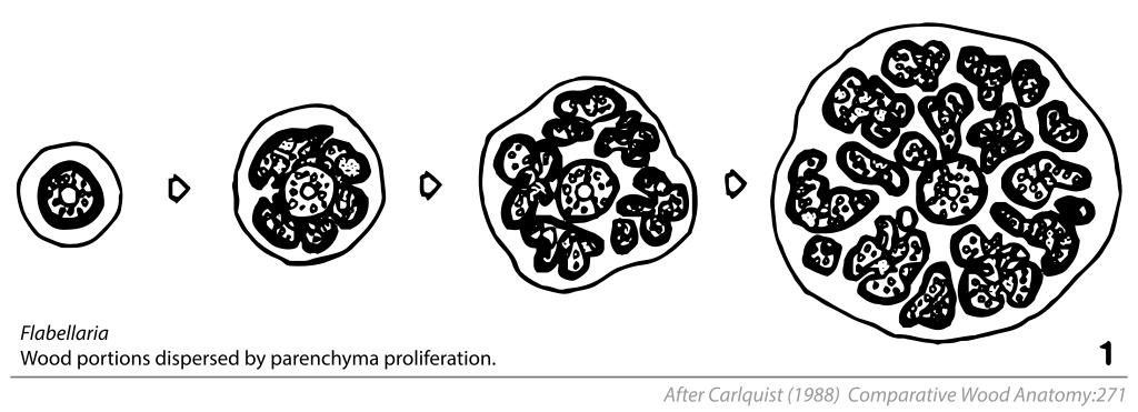 | Keywords: Cambial Variants (Anomalous Secondary Growth) Fig. 8.6.1 Flabellaria.svg en Fig 8 6 Cambial variants in which the cambium is or becomes separated into several segments Four stages in development are shown for each species Flabellaria has origin of xylem segments outside the original cylinder; these segments are expanded and dispersed by parenchyma proliferation Serjania corrugata has a xylem cylinder consisting of arcs in sectional view ; the arcs are converted to cylinders Serjania fuscifolia has cortical bundles; xylem is added to each of these and to the original cylinder in Fig 8 4 Conventions for this and other figures in this chapter black phloem blank with circles indicating vessels xylem; stippled axial parenchyma vertical or variously diagonal lines in pairs rays 1988-01-01 S Carlquist 1988 p 271 Fig 8 6 Chapter 8 Cambial Variants Anomalous Secondary Growth In Comparative Wood Anatomy Part of the series Springer Series in Wood Science Springer Verlag Berlin Heidelberg S Carlquist 1988 other versions Custom license marker 2016 05 08 Tracing data from a scientific diagram taken from primary scientific literature not the scope of copyright laws PD-ineligible Equivalent to cc-0 Wood anatomy Flabellaria |