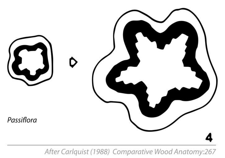 | Keywords: Cambial Variants (Anomalous Secondary Growth) Fig. 8.5.4 Passiflora.svg en Fig 8 5 Diagrammatic representations showing ontogenetic sequences in cambia that have normal products phloem to outside xylem to inside but abnormal conformation Cambium produces more xylem in some places than others to achieve flattened or lobed stems Grooved xylem results from cambium that acts unilaterally little or no xylem in grooves Phaedranthus ; progressively unilateral activity may expand along margins of grooves resulting in ledged zig-zag appearance Passiflora Presence of xylem plates separated by rays results from sluggish cambial activity in ray areas in Fig 8 4 Conventions for this and other figures in this chapter black phloem blank with circles indicating vessels xylem; stippled axial parenchyma vertical or variously diagonal lines in pairs rays 1988-01-01 S Carlquist 1988 p 267 Fig 8 5 Chapter 8 Cambial Variants Anomalous Secondary Growth In Comparative Wood Anatomy Part of the series Springer Series in Wood Science Springer Verlag Berlin Heidelberg S Carlquist 1988 other versions Custom license marker 2016 05 08 Tracing data from a scientific diagram taken from primary scientific literature not the scope of copyright laws PD-ineligible Equivalent to cc-0 Wood anatomy Passiflora |