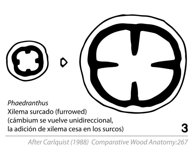 | Keywords: Cambial Variants (Anomalous Secondary Growth) Fig. 8.5.3 Phaedranthus.svg en Fig 8 5 Diagrammatic representations showing ontogenetic sequences in cambia that have normal products phloem to outside xylem to inside but abnormal conformation Cambium produces more xylem in some places than others to achieve flattened or lobed stems Grooved xylem results from cambium that acts unilaterally little or no xylem in grooves Phaedranthus ; progressively unilateral activity may expand along margins of grooves resulting in ledged zig-zag appearance Passiflora Presence of xylem plates separated by rays results from sluggish cambial activity in ray areas in Fig 8 4 Conventions for this and other figures in this chapter black phloem blank with circles indicating vessels xylem; stippled axial parenchyma vertical or variously diagonal lines in pairs rays 1988-01-01 S Carlquist 1988 p 267 Fig 8 5 Chapter 8 Cambial Variants Anomalous Secondary Growth In Comparative Wood Anatomy Part of the series Springer Series in Wood Science Springer Verlag Berlin Heidelberg S Carlquist 1988 other versions Custom license marker 2016 05 08 Tracing data from a scientific diagram taken from primary scientific literature not the scope of copyright laws PD-ineligible Equivalent to cc-0 Wood anatomy Phaedranthus |
