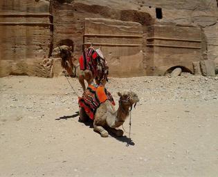 Keywords: camel pair colorful blanket saddle rock desert sand stones carved pastel standing sitting