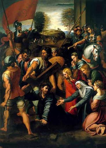 | Keywords: Camino del Calvario, de Juan Carreño de Miranda (Real Academia de Bellas Artes de San Fernando).jpg  El lienzo representa a Cristo cargando con la cruz y camino del Monte Calvario donde sería crucificado y es una copia pintada en el siglo XVII por Juan Carreño de Miranda de la obra El Pasmo de Sicilia o Caída en el camino del Calvario que fue pintada hacia 1515 ó 1517 por Rafael Sanzio y que se conserva actualmente en el Museo del Prado de Madrid España 1674 oil canvas Size cm 235 325 Institution Real Academia de Bellas Artes de San Fernando http //www realacademiabellasartessanfernando com/assets/docs/guia_museo/guia_museo pdf object history exhibition history credit line accession number 745 https //s-media-cache-ak0 pinimg com/736x/27/69/9c/27699c8c383936643b76c3611e048364 jpg PD-old-100 checked Paintings by Juan Carreño de Miranda in the Royal Academy of Fine Arts of San Fernando 17th-century paintings in the Royal Academy of Fine Arts of San Fernando Baroque paintings of Jesus Christ bearing the Cross 17th-century paintings of the Passion of Christ Artwork after Raffaello Sanzio |