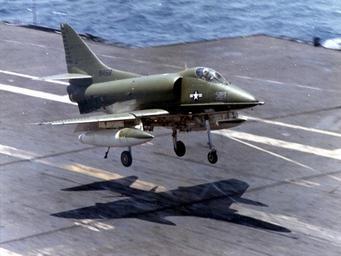 | Keywords: Camouflaged A-4C of VA-113 landing on USS Kitty Hawk (CVA-63) c1966.jpg en A U S Navy Douglas A-4C Skyhawk BuNo 148458 of Attack Squadron VA-113 Stingers landing aboard the aircraft carrier USS Kitty Hawk CVA-63 in the South China Sea after a strike on the Viet Cong in South Vietnam VA-113 was assigned to Carrier Air Wing 11 CVW-11 aboard the Kitty Hawk for a deployment to Vietnam from 19 October 1965 to 13 June 1966 The U S Navy experimented with aircraft camouflage and painted half of the aircraft of Attack Carrier Air Wing 11 CVW-11 with dark green colours to blend in with the Vietnamese jungle The results proved inconclusive for the U S Navy whereas the U S Air Force concluded that the camouflage was effective U S Navy planes would not be camouflaged until the 1980s Note that oil from the engine oil breather has streaked the camouflage paint http //collections naval aviation museum/emuwebdoncoms/pages/doncoms/AdvQuery php U S Navy National Museum of Naval Aviation photo No http //collections naval aviation museum/emuwebdoncoms/pages/doncoms/Display php irn 16004243 QueryPage 2Femuwebdoncoms 2Fpages 2Fdoncoms 2FAdvQuery php 1996 253 4974 ca 1966 USN PD-USGov-Military-Navy A-4C Skyhawk Flight deck of USS Kitty Hawk CV-63 Strike Fighter Squadron 113 United States Navy Aircraft camouflage |