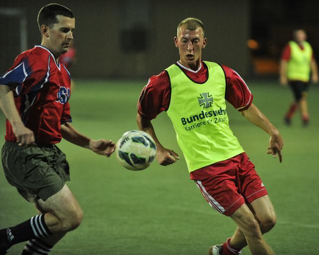 Keywords: Camp Lemonnier World Cup - USA vs. Germany 140128-N-LE393-786.jpg en Players vie for control of the ball during a soccer match between a German military team in yellow and an American military team at Camp Lemonnier Djibouti Jan 28 2014 The Americans won the match 6-0 and will advance to the finals of the 2014 Camp Lemonnier World Cup U S Navy photo by Mass Communication Specialist 1st Class Eric Dietrich/Released 2014-01-28 Petty Officer 1st Class Eric Dietrich https //www dvidshub net/image/1161571 140128-N-LE393-786 2014-02-05 06 13 CAMP LEMONNIER DJ PD-USGov-Military-Navy Camp Lemonnier Images from DoD uploaded by Fæ |