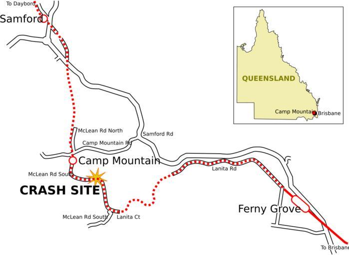 Keywords: Camp-Mountain-train-disaster-map.svg en Map of the Camp Mountain train disaster north-west of Brisbane Australia own MHz`as Camp Mountain rail accident Rail transport maps of Queensland