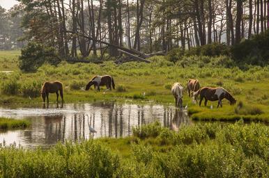 Keywords: nature public domain publicdomain landscape scenic serene horse horses pony ponies marsh water woods green free outdoor field grassland Chincoteague, VA, USA Chincoteague, VA, USA