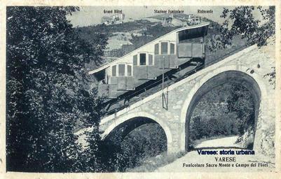 Keywords: Vista del complesso turistico del Campo dei Fiori ripreso con una delle carrozze della funicolare per il Sacro Monte (linea inaugurata nel 1909). Al centro il Grand Hotel ancora in costruzione (terminato nel 1912) a destra la stazione a monte della funicolare e il Ristorante Campo dei Fiori (entrambe completate nel 1911). Tutte e tre le opere sono state progettate dall'arch. Giuseppe Sommaruga tra il 1908 e il 1910. varese funicolare campodeifiori |