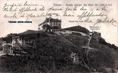 Keywords: Il complesso turistico del Campo dei Fiori. Al centro il Grand Hotel (terminato nel 1912) a destra la stazione a monte della funicolare e il Ristorante Campo dei Fiori (entrambe completate nel 1911). Tutte e tre le opere sono state progettate dall'arch. Giuseppe Sommaruga tra il 1908 e il 1910, così come gran parte delle ville che si vedono in basso ancora in costruzione. In alto le tre croci e i versanti della montagna completamente privi di copertura vegetale. varese funicolare campodeifiori |