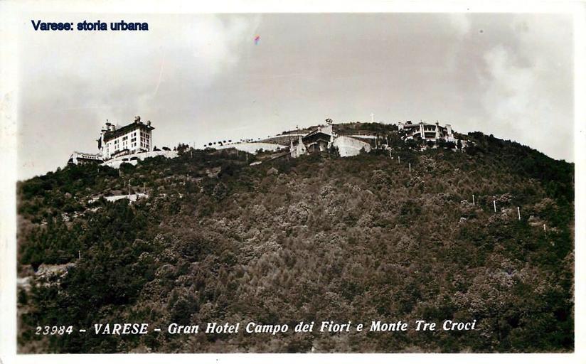 Keywords: Il complesso turistico del Campo dei Fiori. A sinistra il Grand Hotel (terminato nel 1912) al centro la stazione a monte della funicolare e a destra il Ristorante Campo dei Fiori (entrambe completate nel 1911). Tutte e tre le opere sono state progettate dall'arch. Giuseppe Sommaruga tra il 1908 e il 1910. In alto le tre croci (1901). varese campodeifiori
