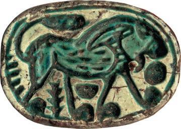 Keywords: Canaanite - Scarab with Walking Lion Design - Walters 4236 - Bottom.jpg The ancient Egyptians believed that the dung beetle the Scarabaeus sacer was one of the manifestations of the sun god Representations of these beetles were used as amulets and for ritual or administrative purposes This scarab displays on its bottom the motif of a walking lion The mouth of the animal is wide open and the tail raised upon its back A sun disk appears below its head an nb-basket below its belly a bush between its hindlegs and further floral elements behind its body The lion figure fills nearly the whole space; only in front between and behind its extremities is some space to convey the environment The figure of the lion has a short body a large head and slim legs with very large paws The size and round shape of these paws correspond to the form of the sun disk The layout is balanced and tightly packed the figure of the lion and the other elements fill the whole space and there is empty space only between the frontlegs of the lion The head of the lion is on the bottom of the head segment of the scarab The highest point of the back is the pronotum dorsal plate of the prothorax Two side-notches at shoulder height which differ in depth and are not totally aligned define the partition between pronotum and elytron wing cases The triangular head has incised borderlines; the irregular side plates have side-notches and the four times serrated clypeus a short central base notch The raise extremities have natural form and diagonal hatch lines for the tibial teeth and pilosity hair ; the background is deeply hollowed out The oval base is symmetrical and the drill-hole openings framed The scarab is longitudinally pierced was originally mounted or threaded and functioned as a protective amulet with royal connotation Particularly it refers to divine royal power lion and solar presence sun disc as a life spending force plants and should assure protection and renewal for its owner There are several parallels for this motif on the bottom of scarabs The type with an open mouth is typical for examples from Palestine Lion icons have royal and heavenly connotations and the sub-icons specify or modify the exact meaning ca 1648 1539 BC Second Intermediate; late MB IIB light beige steatite with green-blue glaze cm 0 9 1 5 2 1 accession number 42 36 34037 Henry Walters Baltimore date and mode of acqusition unknown Walters Art Museum Henry Walters Acquired by Henry Walters place of origin Canaan/Israel Walters Art Museum license Ancient Near East art in the Walters Art Museum Canaanite art Media contributed by the Walters Art Museum needs category review |