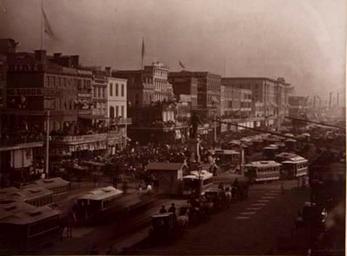 Keywords: Canal Street Trams 1877 2.jpg Canal Street New Orleans 1877 Photo looking riverwards from an elevated point around the intersection of Canal Carondelet Back of Henry Clay statue in neutral ground large number of horse trams Crowds are in street and on balconies leading to speculation that photo was taken at event; possibly shows gathering before the Rex Mardi Gras parade Photograph by Theodore Lilienthal via Historic New Orleans Collection 1877 Theodore Lilienthal PD-Old 1877 in New Orleans Theodore Lilienthal Canal Street New Orleans Central Business District Horse trams in New Orleans 1877 in tram transport |