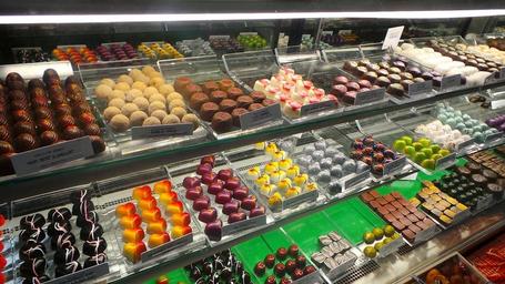 Keywords: candies store merchant display case sweets tasty retailer chocolate candy delicious dessert dark cocoa brown sugar gourmet confections treats