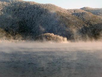 Keywords: canim lake british columbia canada water winter early morning steam cold snow landscape scenery