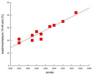 | Keywords: Cannabis-France-experimentation.svg Expérimentation du cannabis en France chez les 15-44 ans dans les années 1990 et 2000 données de sondages points et régression linéaire de l'évolution temporelle Self-made by uploader from data displayed in Jean-Michel Costes ed Cannabis données essentielles Observatoire français des drogues et des toxicomanies Saint-Denis 2007 ISBN 978-2-11-096697-1 2008-06-19 User Brachycerophilia Cannabis in France Linear regression Cannabis-related graphics | ||||